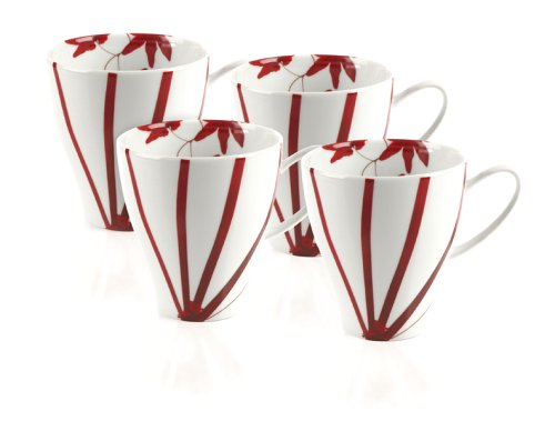 Pure Red dinnerware from Mikasa sets a strikingly fresh and appealing table. Contemporary, sleek white shapes decorated with asymmetrical floral sprays and starburst designs in bright red speak of an Asian inspiration. Made of high-fired porcelain from Portugal, Pure Red durably stands up to everyday dining and is safe for the microwave and dishwasher. --Ann Bieri Dramatic contemporary red maple leaf interpreted design radiates on pure white porcelain transitional body. Some pieces have solid red crackle accent. A set of 4 12-oz. capacity mugs compliments Pure Red dinnerware pattern..